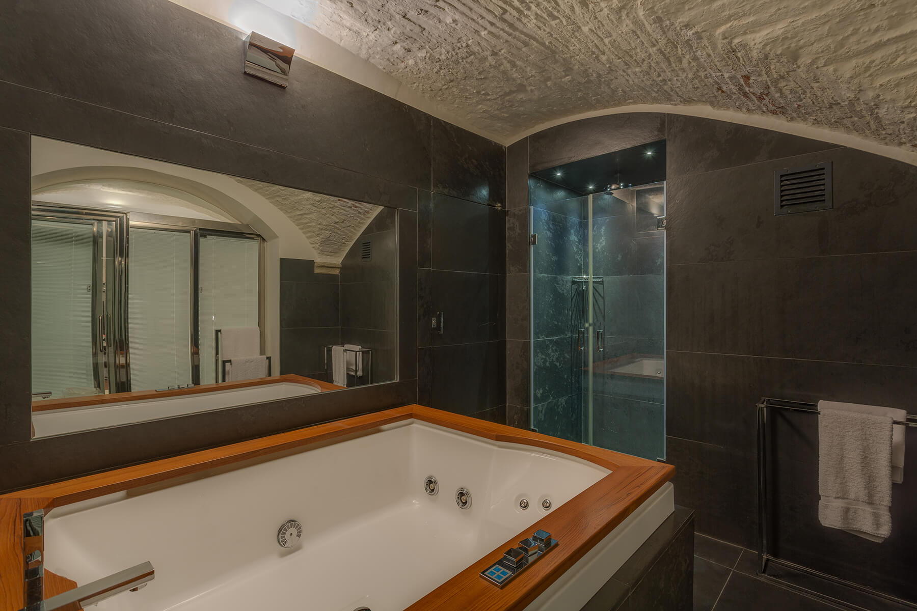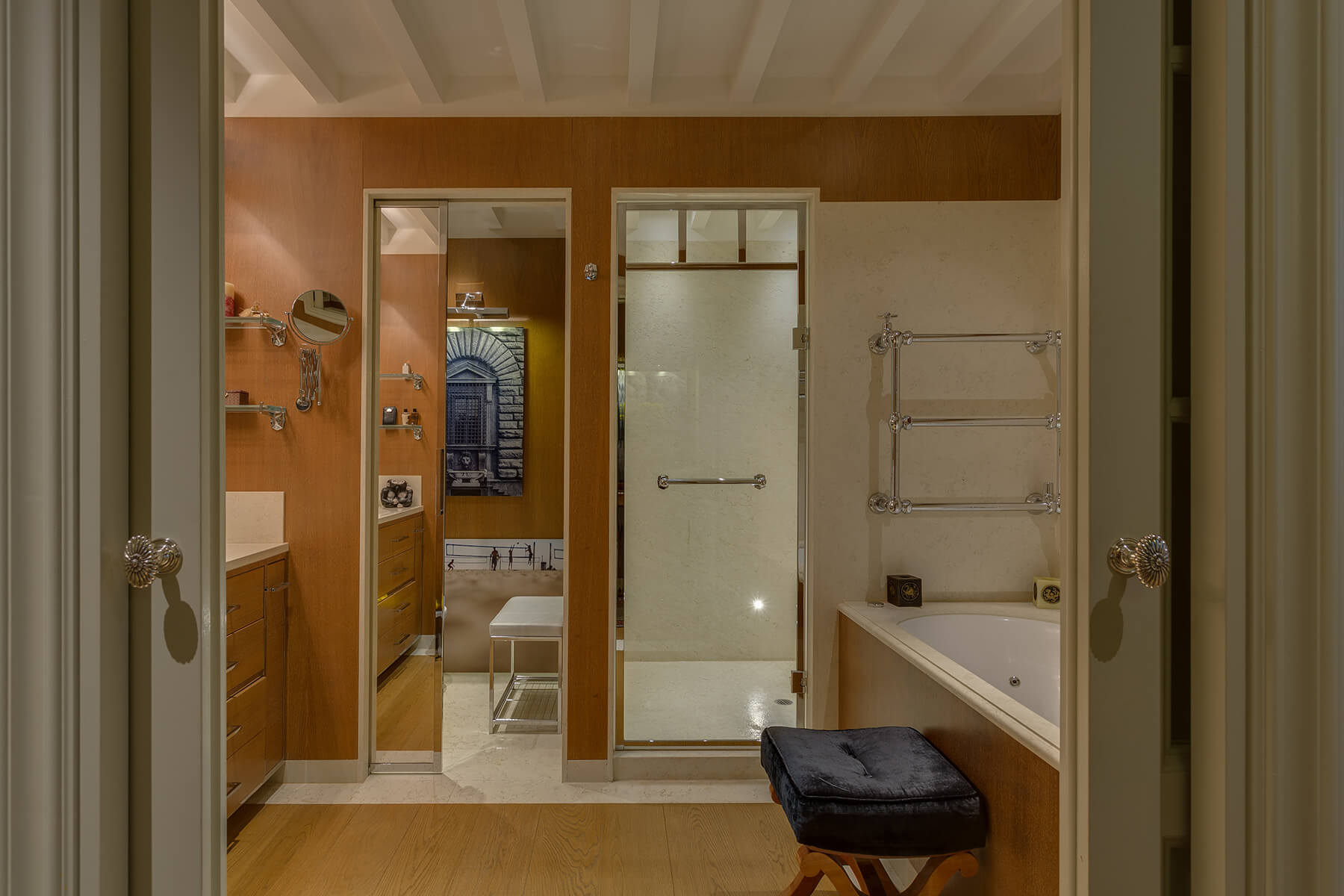 This exceptional and splendid residenza is composed of a master kingsize bedroom with a bathroom, whirlpool tub, shower, double sink, a walk-in closet, and a cozy study with a wood-burning fireplace. There are two double guest bedrooms with an ensuite bathroom, one of which has a whirlpool tub and shower as well as a walk-in closet.