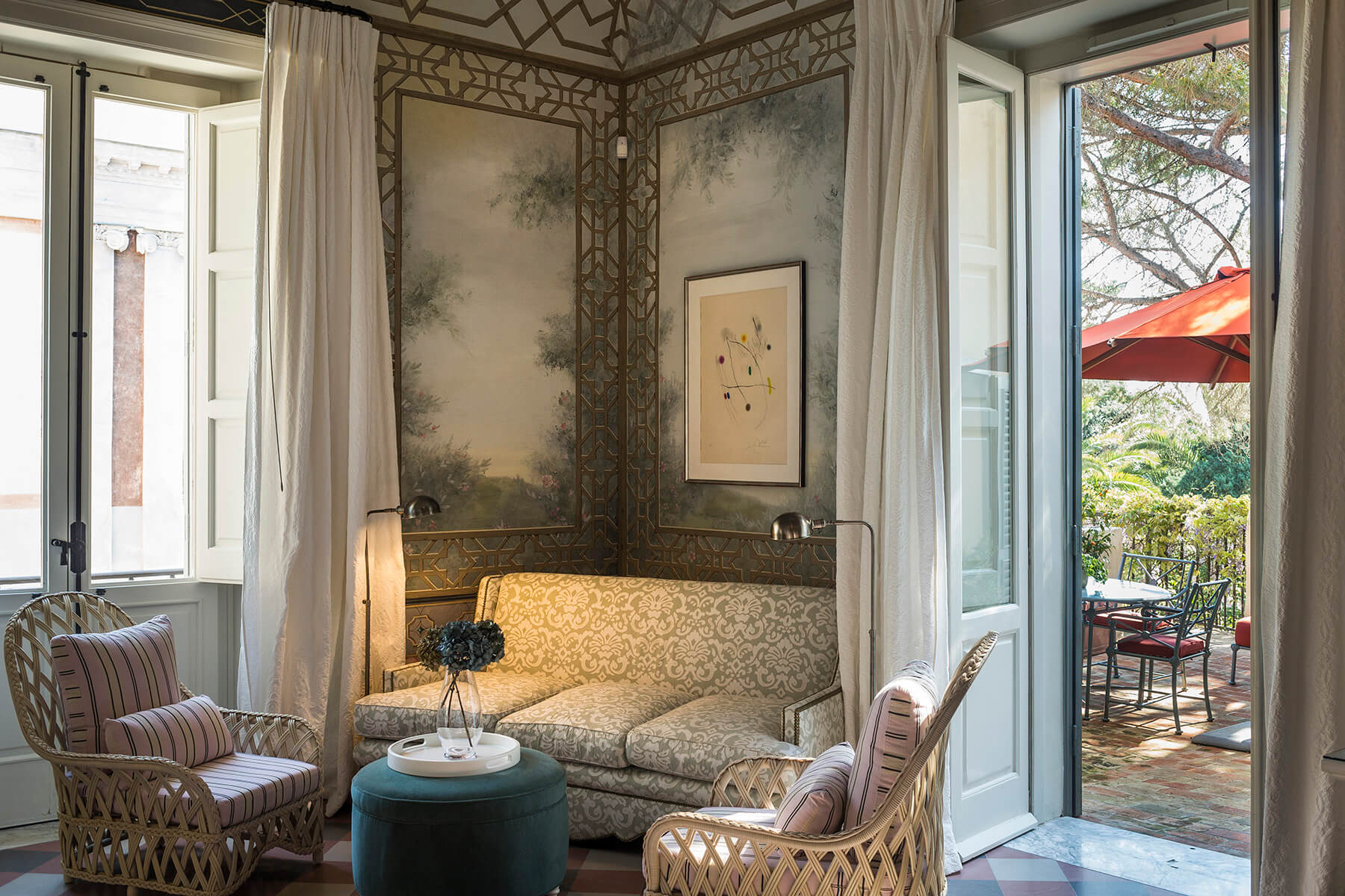 The interiors of Palazzo Italiano, with its exquisite vaulted ceilings, tiled floors, and hand-painted fresco ceilings, restored and designed by acclaimed French designer, Jacques Grange, are a sight to behold.