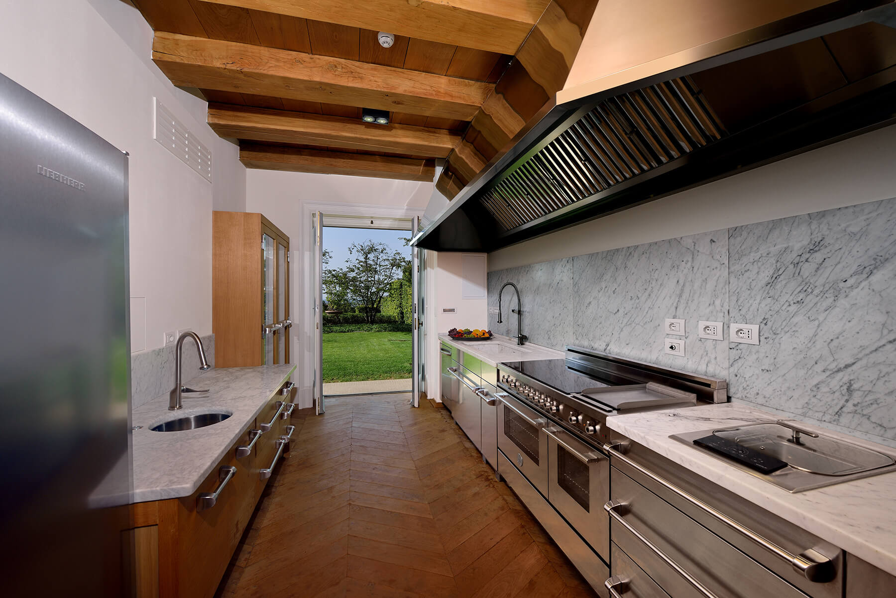 On the ground floor of the villa, you can enjoy a spacious and elegant living room with large windows and direct access to the garden, a cozy dining room with a fireplace, and the ultra-modern fully equipped kitchen opens up onto the garden.