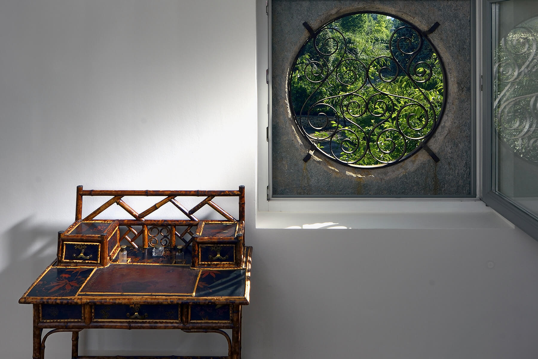 The villa’s two floors are connected by a unique two-storey library designed by local artisans. On the ground floor, a conservatory of over 40 sqm leads to a sublime private garden with ancient oak trees.